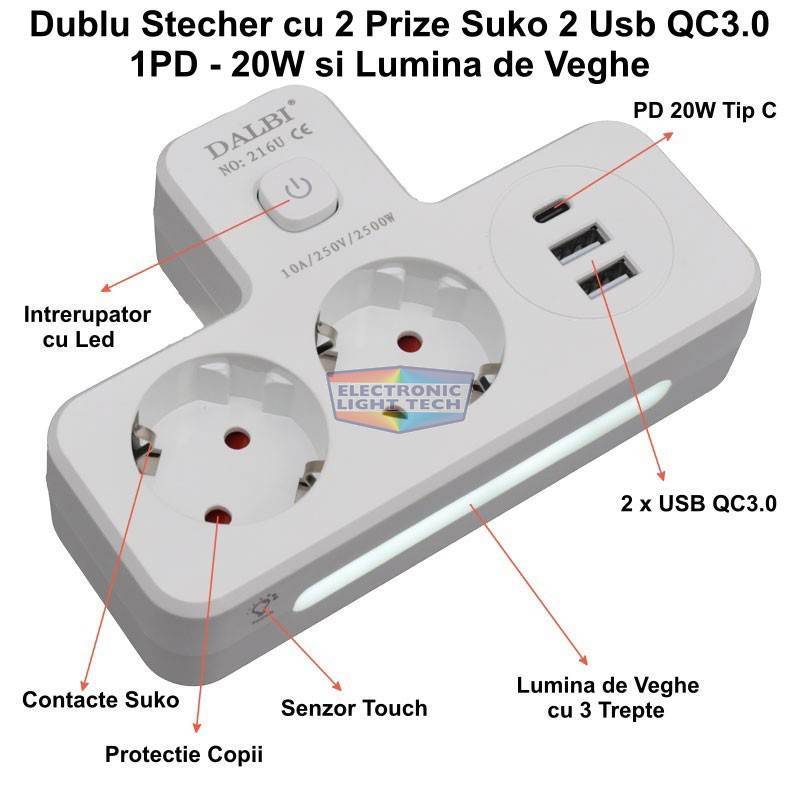 Soluție inteligentă și compactă care transformă orice priză de perete într-un hub de încărcare rapidă și sursă de iluminat. Acest dublu stecher combină 2 prize electrice cu tehnologie de încărcare avansată și lumină de veghe integrată, oferind funcționalități complete într-un design ergonomic.